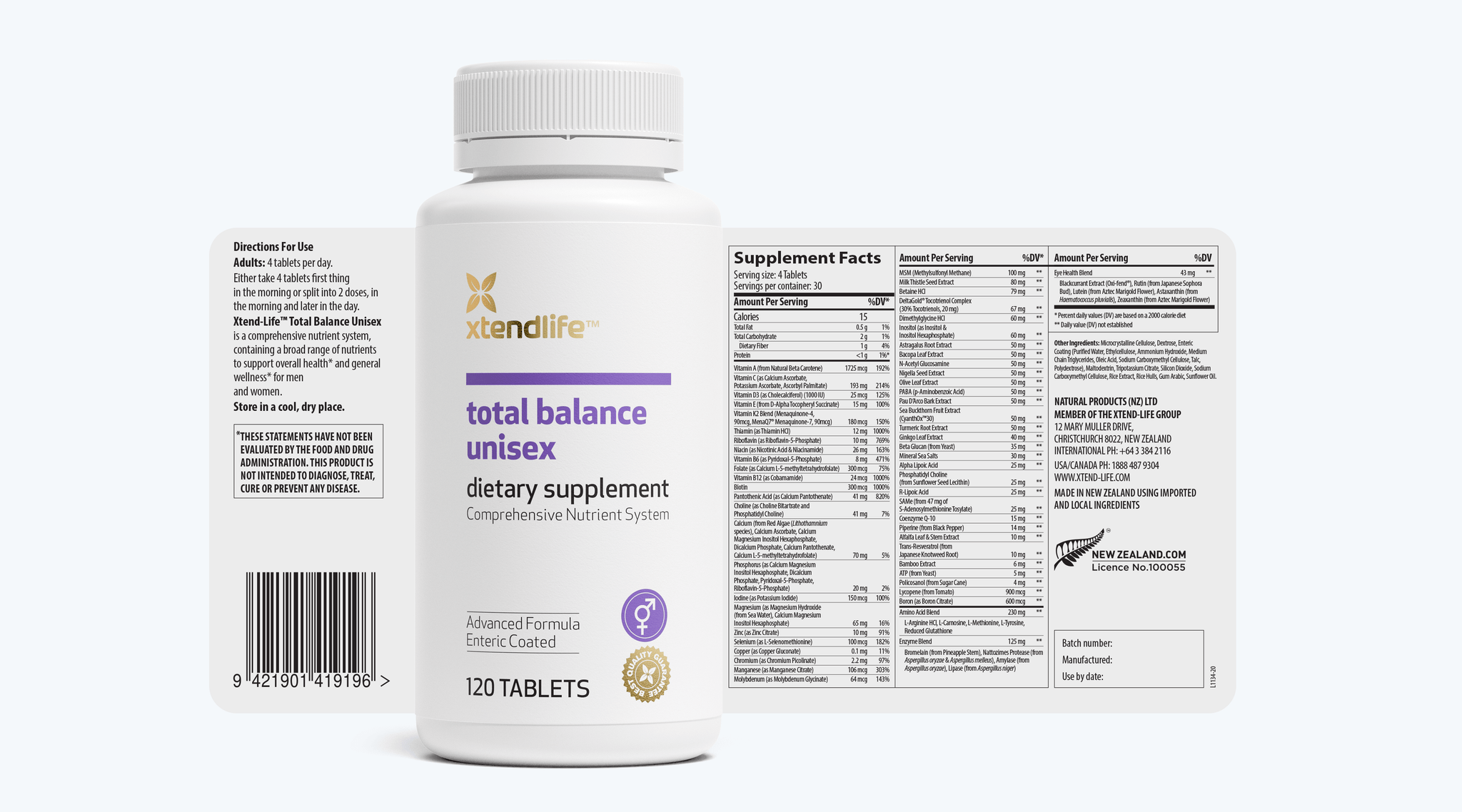Total Balance Unisex is formulated with the most potent form of nutrients that ticks all the boxes for quality and efficacy, and it is enteric coated to ensure maximum nutrient delivery and absorbency.