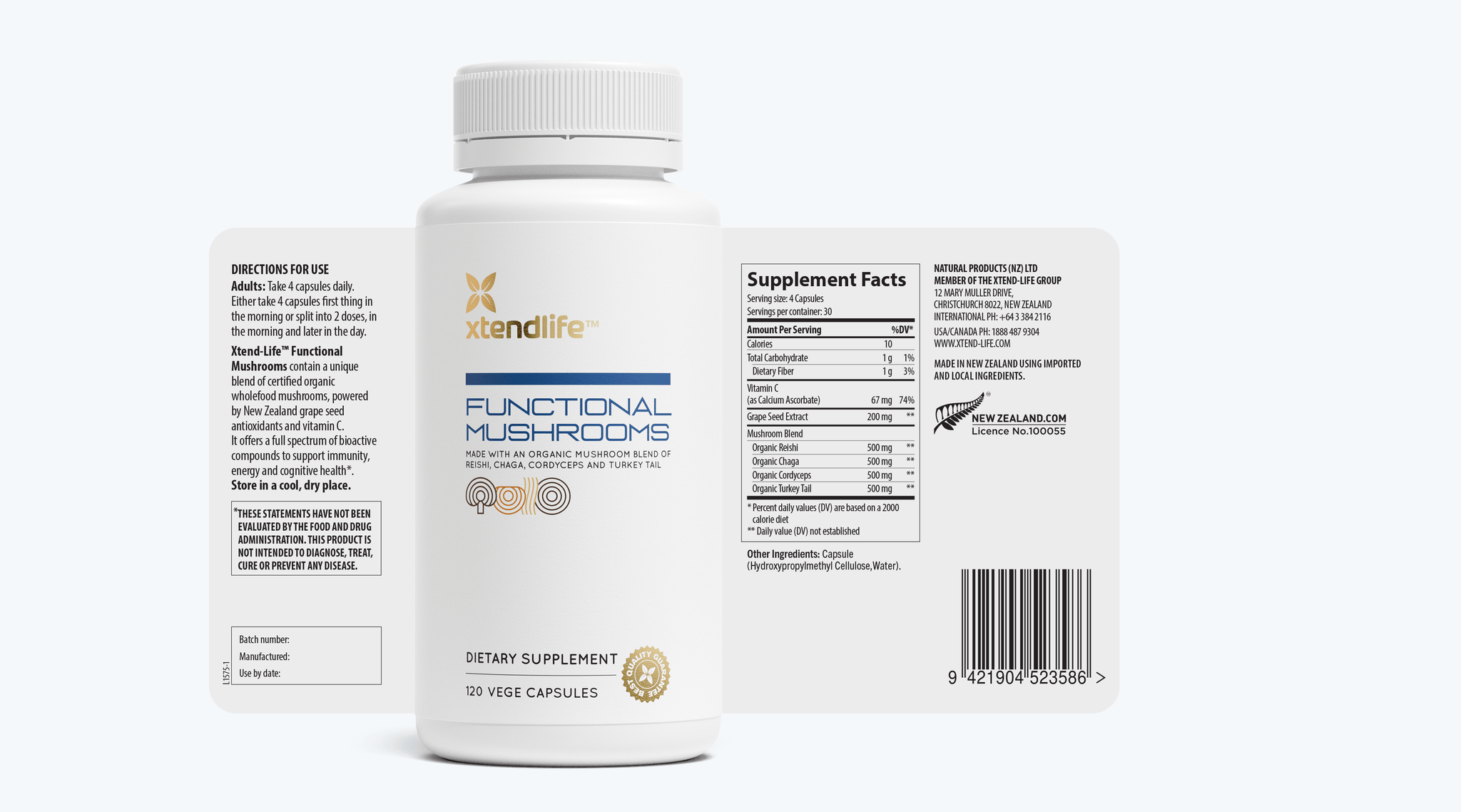 Xtendlife Functional Mushrooms also includes Grape Seed Extract from New Zealand, rich in antioxidants for supporting cell health, cardiovascular health, skin, brain function, and immune health.