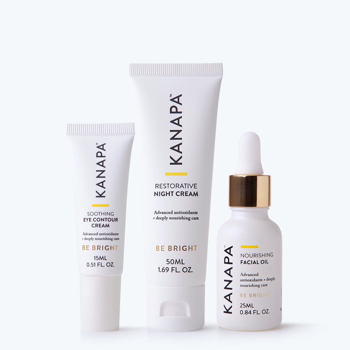 Experience Kanapa™ Evening Ritual Bundle. Hydrate with Restorative Night Cream, rejuvenate with Soothing Eye Contour Cream and replenish with Nourishing Facial Oil – for radiant, balanced skin every morning.